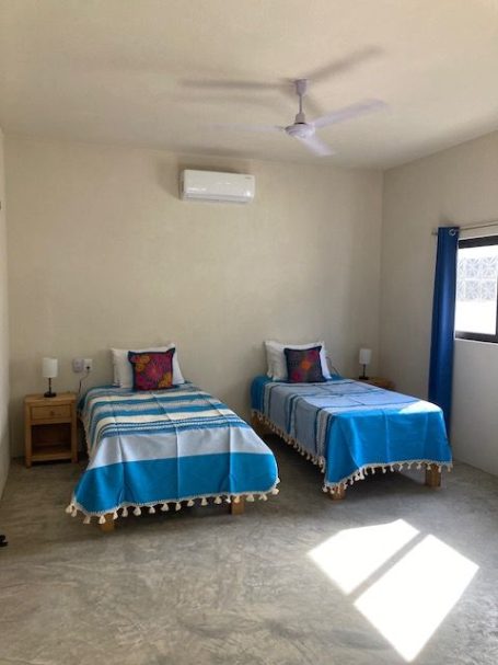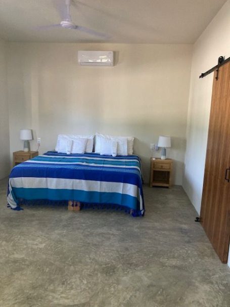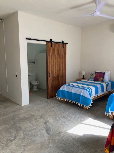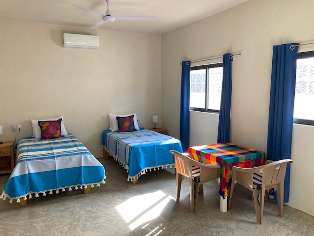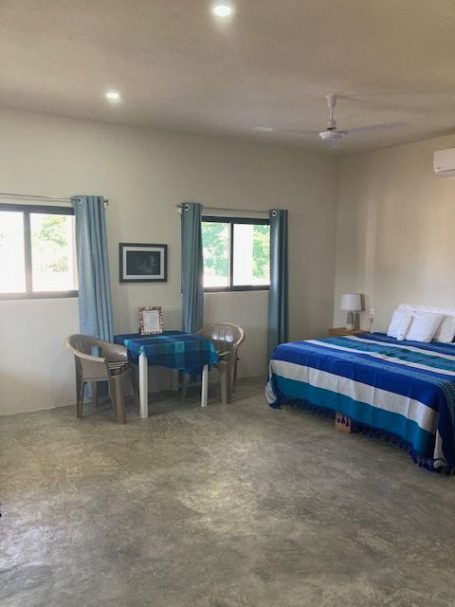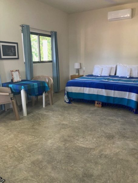 Our two spacious ground-floor suites at Casa AJ offer comfort, privacy, and a relaxed modern style. Each suite has its own private entrance and features a minimalist design with pops of colour. Enjoy polished concrete floors, a king bed (or two twins), a kitchenette, dedicated work space, and a generous amount of room to unpack, unwind, and feel at home. With air conditioning, a full bathroom, and plenty of storage, these non-smoking, pet-free suites are ideal for a comfortable retreat after a day in the sun.